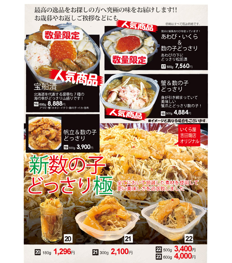 存分に北の海の幸を楽しんでいただきたく、あわび.蟹.いくら.ホタテを贅沢に使い内容量もアップしているので目に入ってくるインパクトは絶大です。